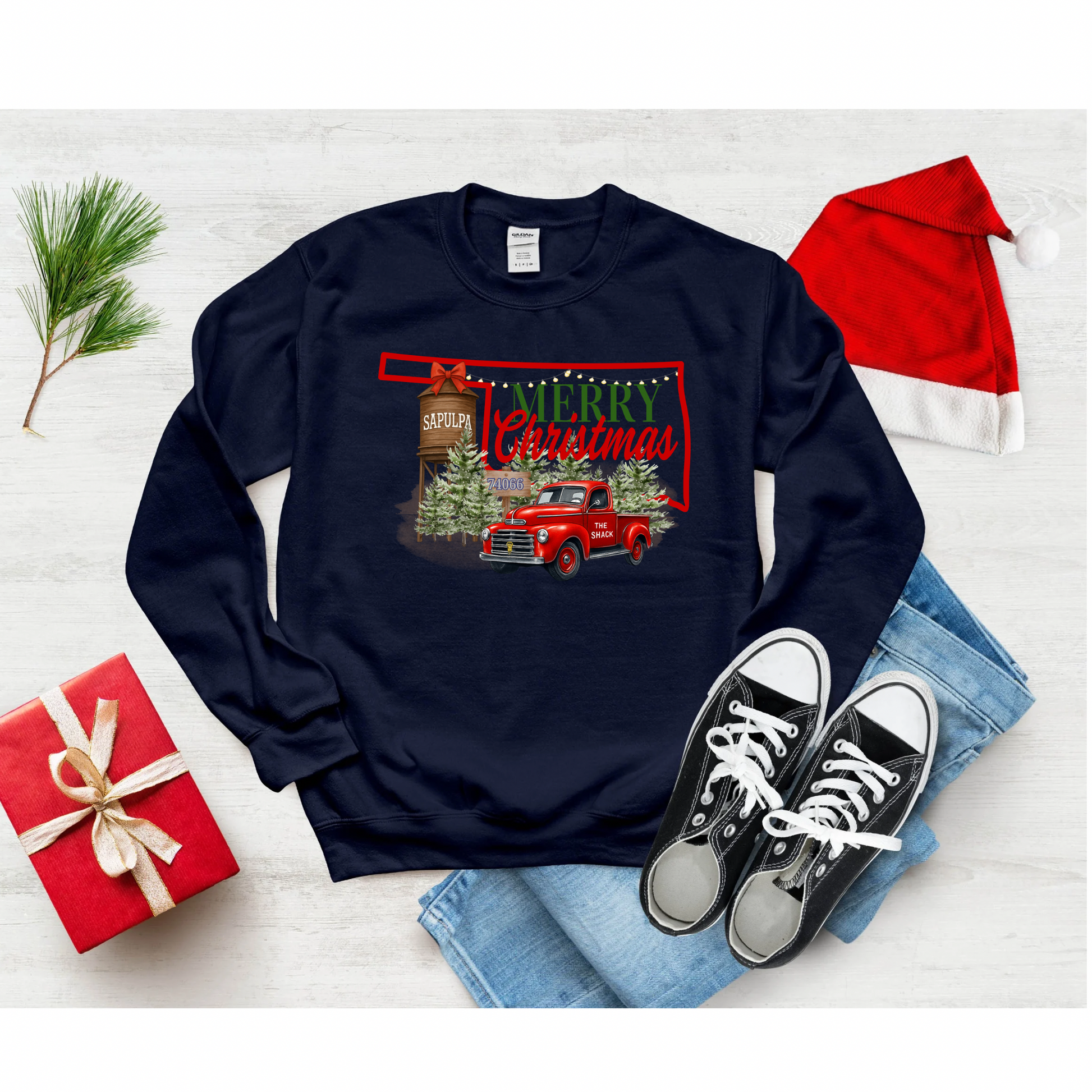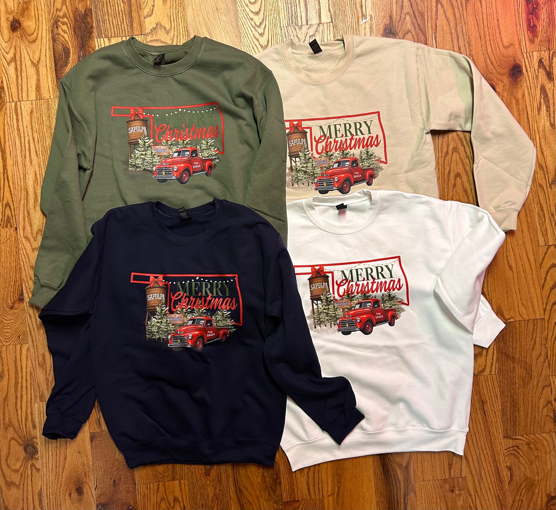 Merry Christmas for Sapulpa, OK. 50/50 cotton/polyester sweatshirt will keep you warm but have little shrinkage. Colors available: Navy, Military Green, Sand, White.