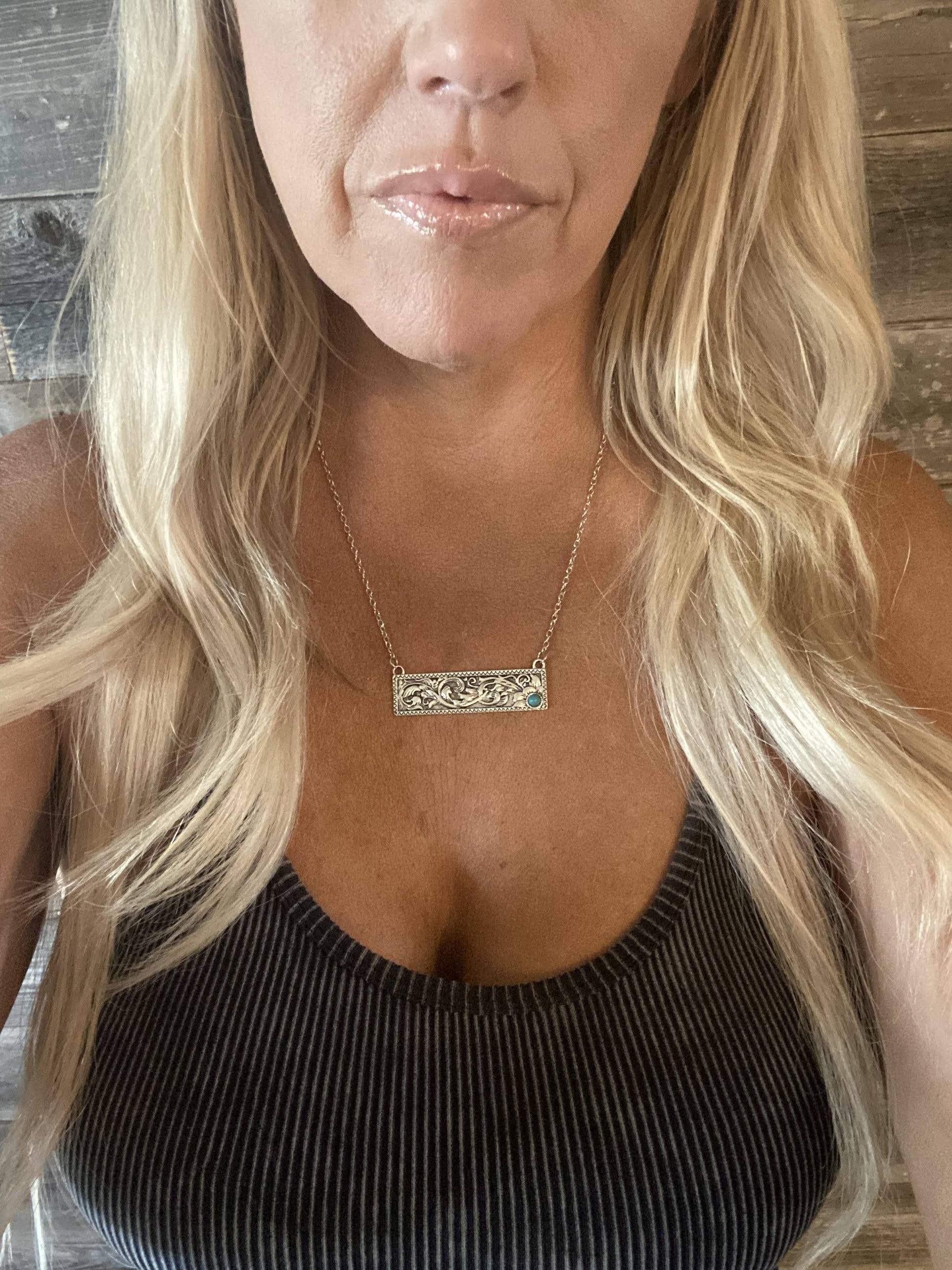 Unleash your daring side with our Tooled Bar Silver Necklace! Featuring intricate scroll work and a eye-catching turquoise accent, this necklace is sure to make a statement. With an adjustable chain, it's versatile for any adventure. Upgrade your style and conquer the day with this bold piece!